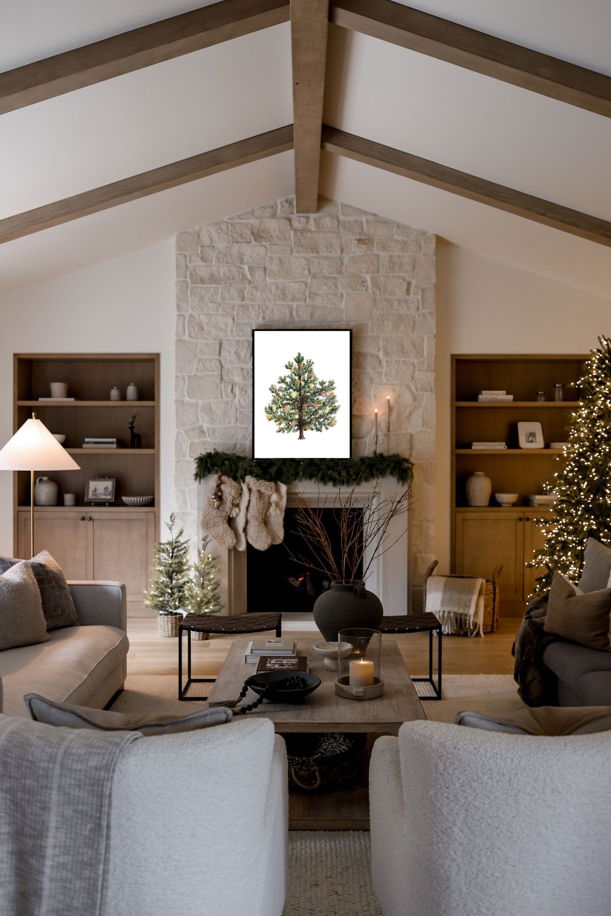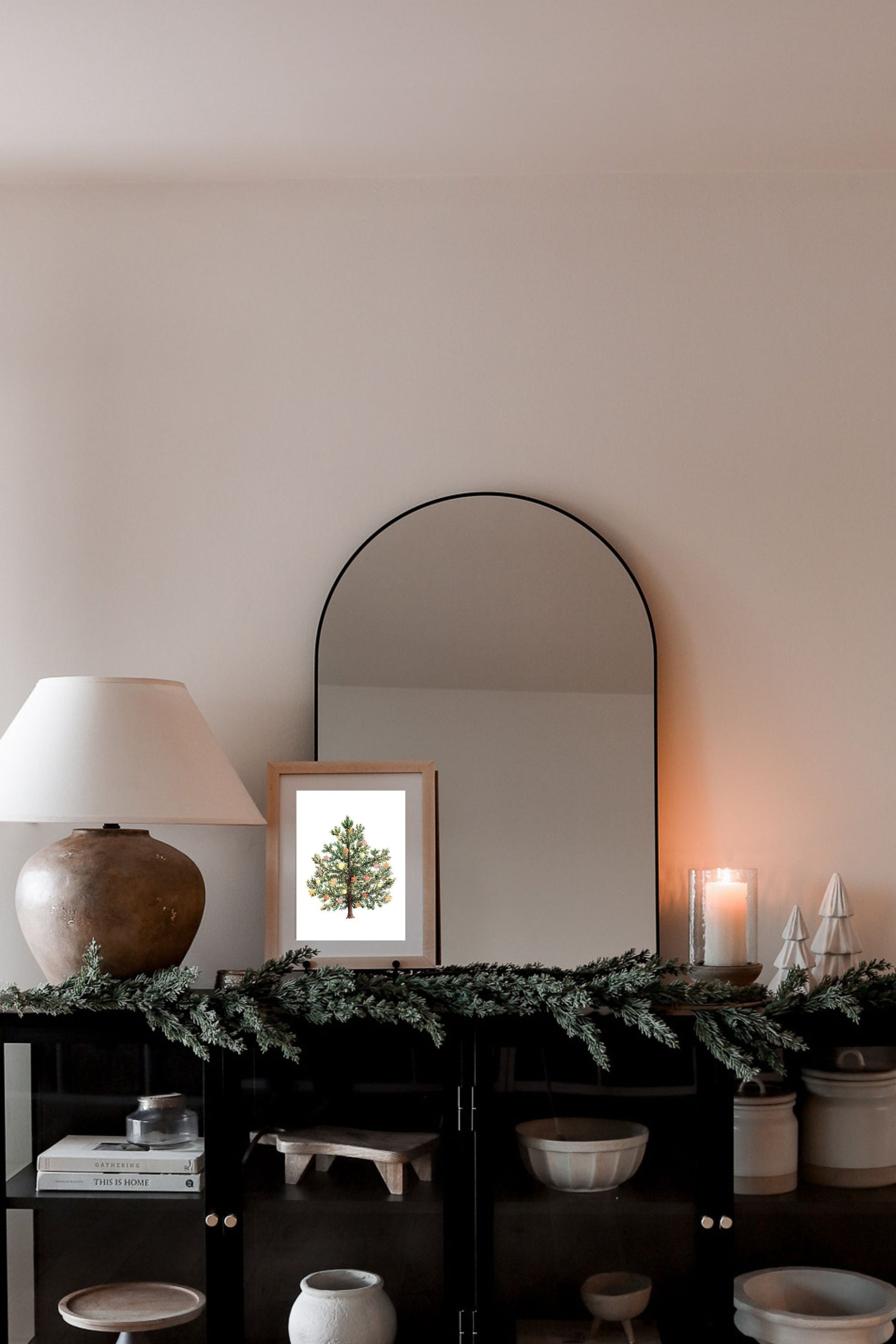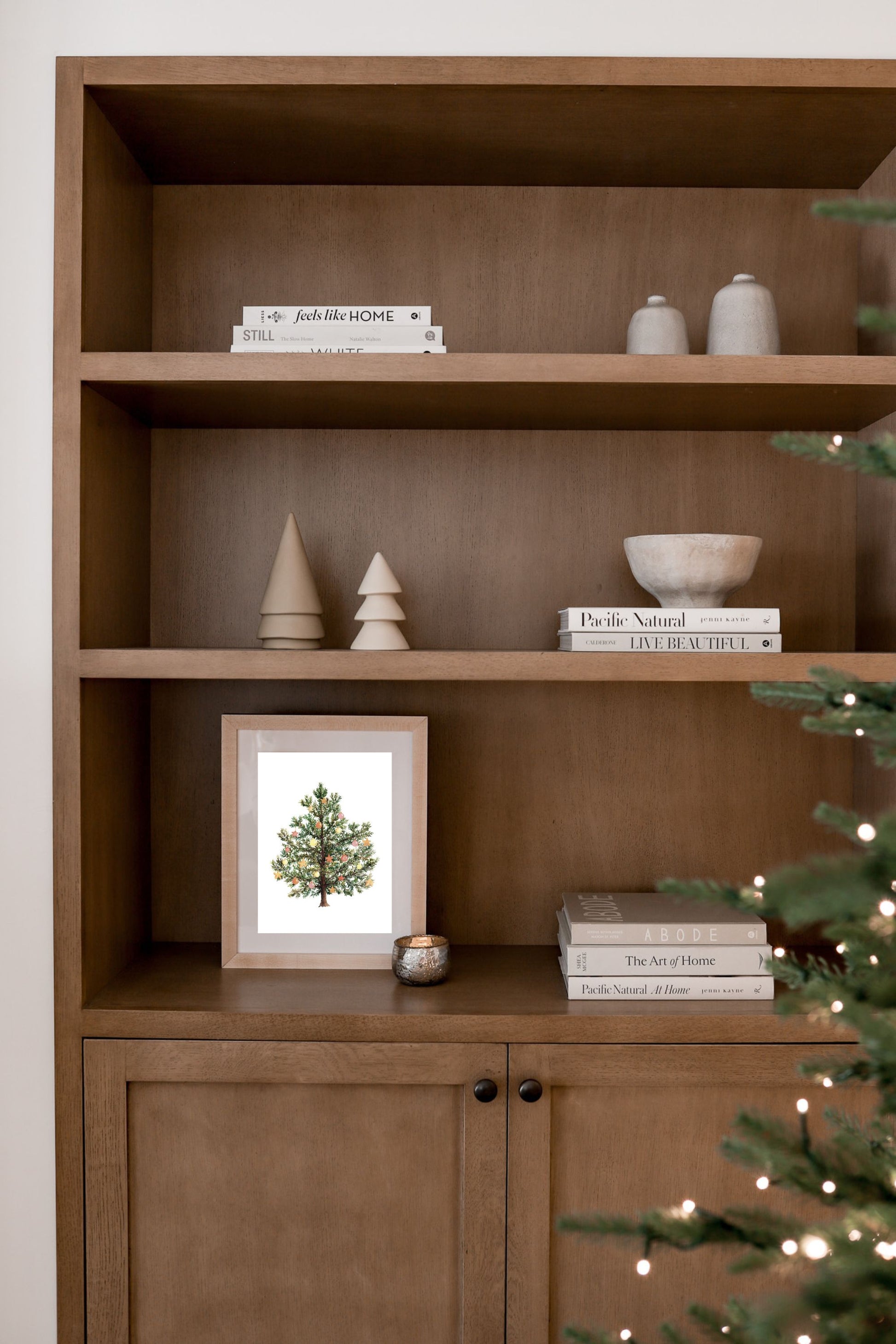 “Small Wonder” celebrates the simple joy of the season with a charming evergreen adorned in soft, festive hues. Warm shades of gold, blush, and coral ornaments glimmer against deep green branches, creating a cozy and cheerful palette. This piece brings a touch of holiday magic and nostalgic warmth to any space.