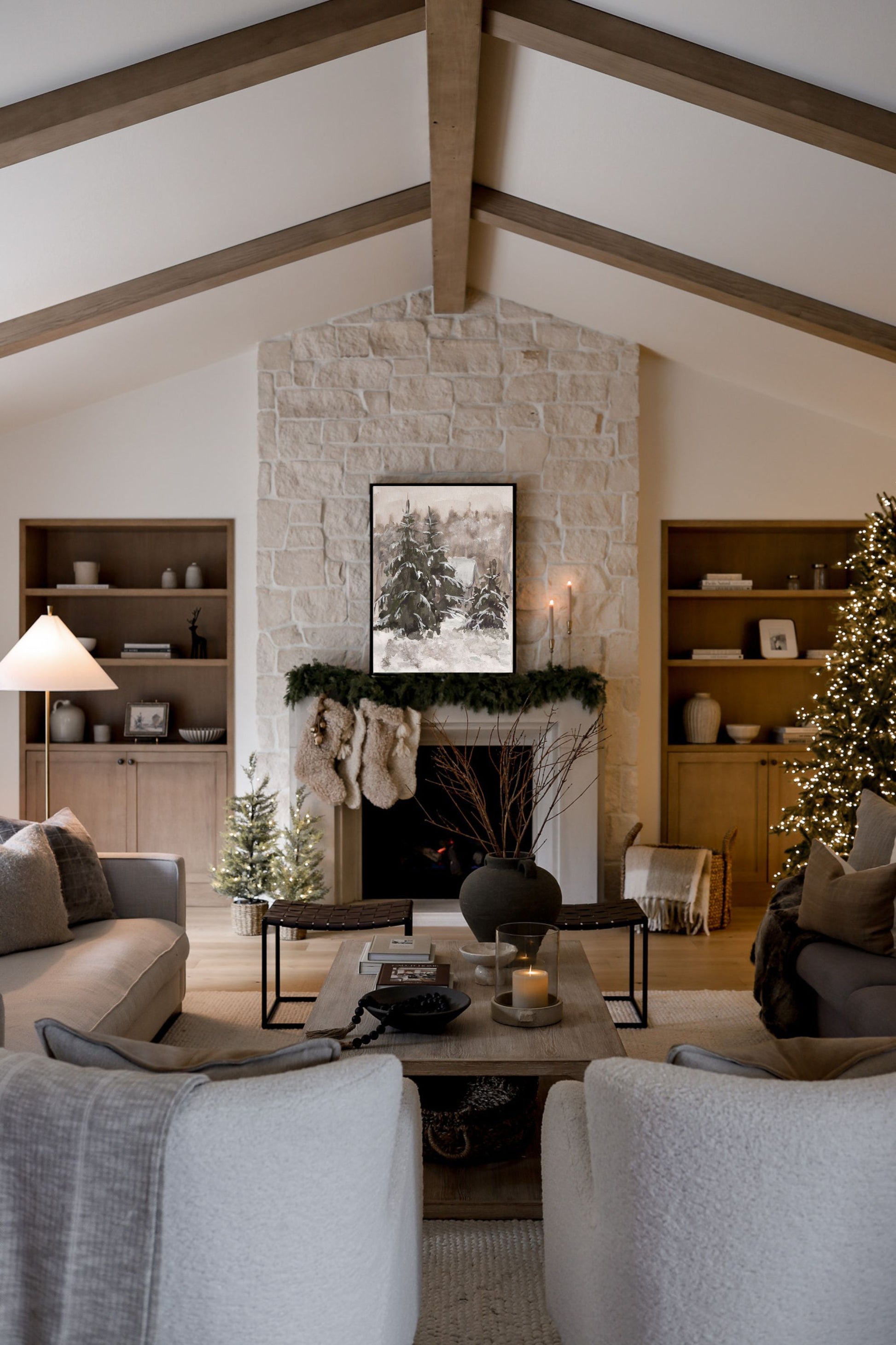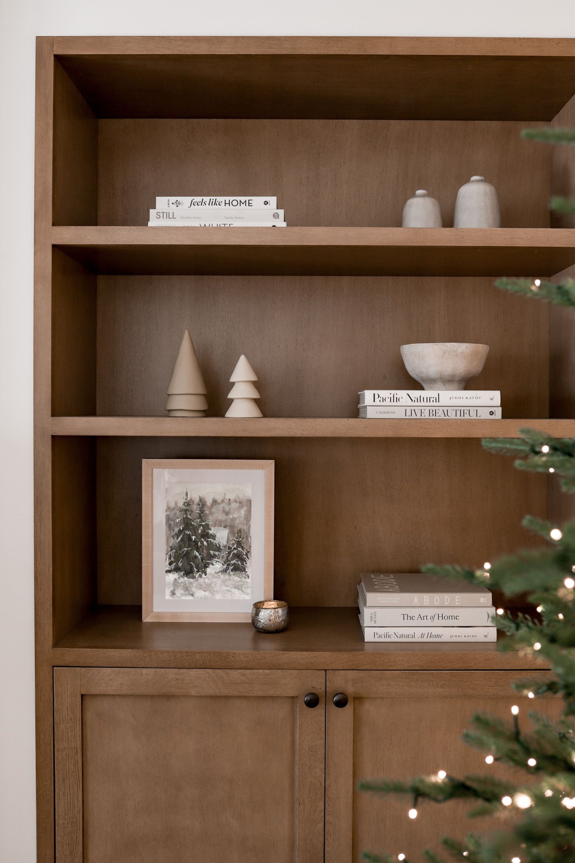“Winter Refuge” captures the quiet stillness of a snow-covered forest, where evergreens stand tall beneath delicate layers of white. Soft shades of taupe, ivory, and muted gray blend seamlessly with deep pine greens to create a peaceful, wintry palette. The gentle watercolor texture gives this piece a calming, timeless feel perfect for adding serene warmth to any space.